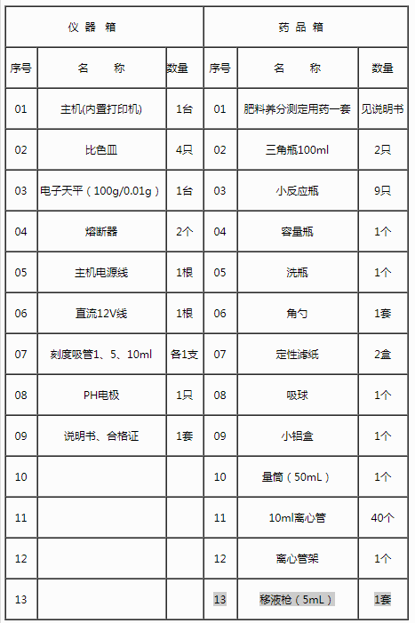 配套齐全,该仪器集药、器、仪为一体,携带方便,相当于一个小型实验室,用户只需提供蒸馏水即可在要求时间内完成全部操作。适于农业服务部门或农资经销商鉴别肥料真假、肥料厂商肥料生产中控、农资质检部门进行农资打假,规范农资市场。