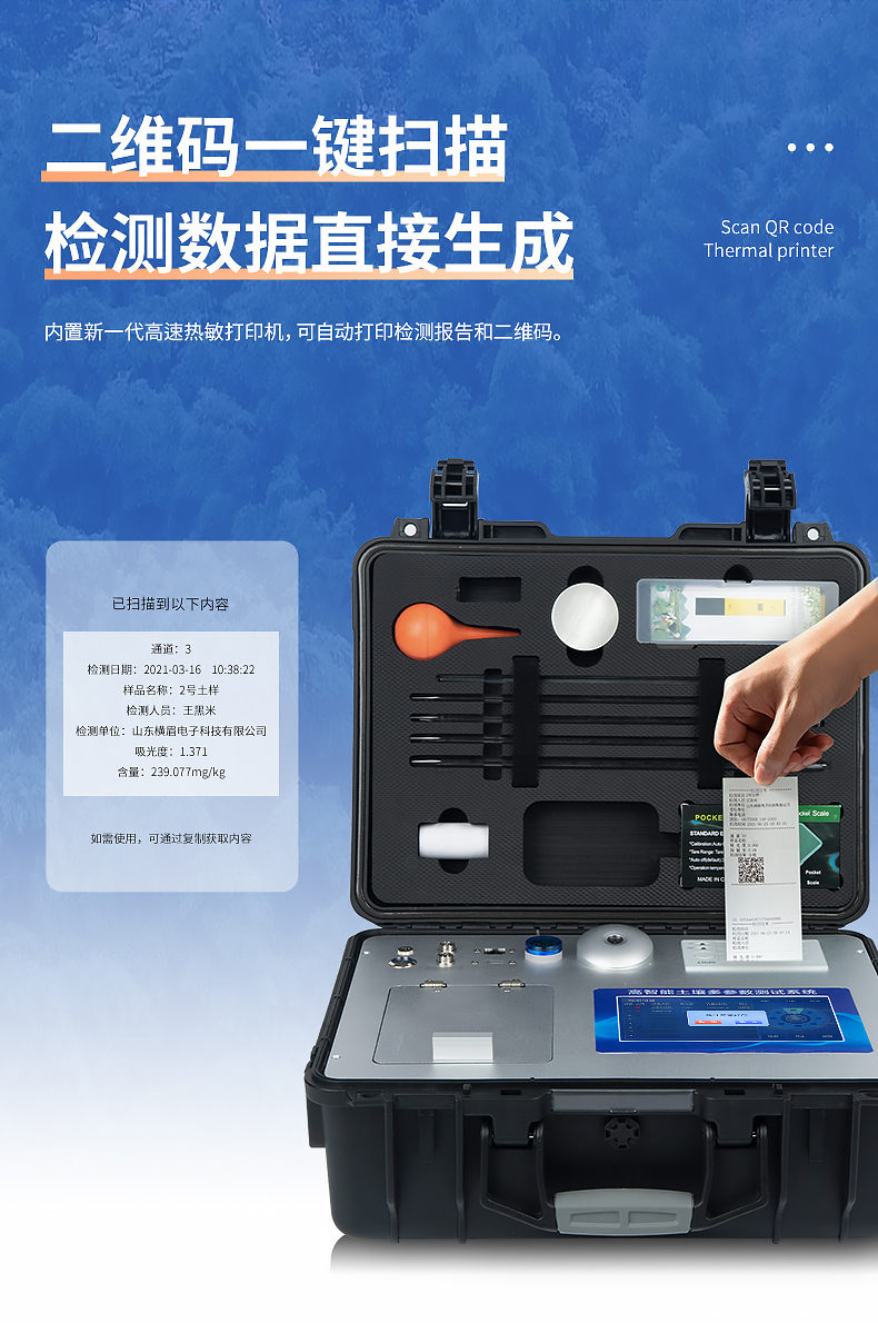 18、内置新一代高速热敏打印机(无需色带),打印内容包含:检测单位、检测人员、检测项目、通道号、吸光度、养分含量(mg/kg)、检测时间、以及二维码等信息
