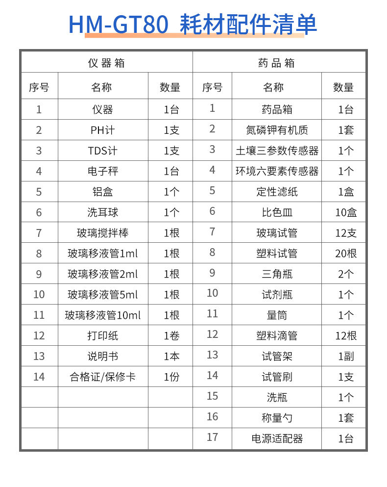 2 | PH计 | 1支 | 2 | 氮磷钾有机质试剂 | 1套 |
