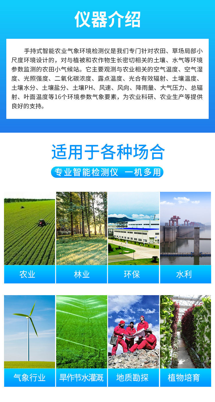 广泛应用于农业、林业、环保、水利、气象行业、旱作节水灌溉、地质勘探、植物培育等领域。