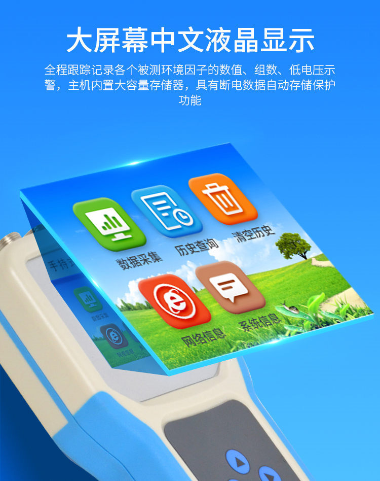 大屏幕中文液晶显示,全程跟踪记录各个被测环境因子的数值、组数、低电压示警,主机内置大容量存储器,可储存三十万条数据,具有断电数据自动存储保护功能。