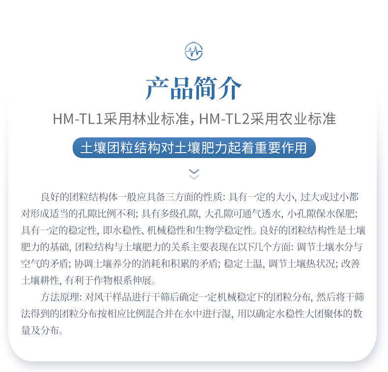 1、土壤团粒结构对土壤肥力起着重要作用。良好的团粒结构体一般应具备三方面的性质:具有一定的大小,过大或过小都对形成适当的孔隙比例不利;具有多级孔隙,大孔隙可通气透水,小孔隙保水保肥;具有一定的稳定性,即水稳性、机械稳性和生物学稳定性。良好的团粒结构性是土壤肥力的基础,团粒结构与土壤肥力的关系主要表现在以下几个方面:调节土壤水分与空气的矛盾;协调土壤养分的消耗和积累的矛盾;稳定土温,调节土壤热状况;改善土壤耕性,有利于作物根系伸展。土壤团粒分析仪适用于土壤、环境、地质等试验室对团聚体的分析。