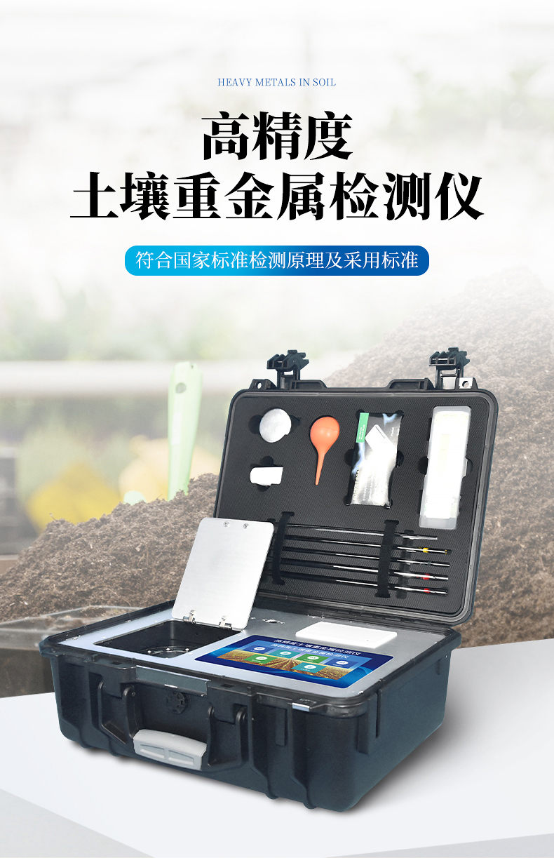 4、土壤重金属检测仪集药,器,仪于一体,相当于一个小型实验室, 两个铝合金箱体,易于携带,便于现场测试,流动服务。适于基层检测部门对含有重金属污染的蔬菜、水果等食品进行筛选。